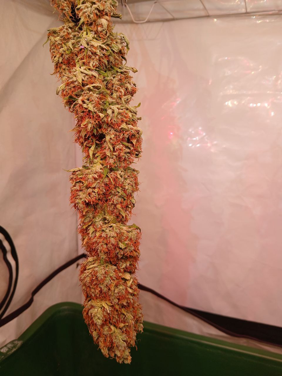 Куст сативной структуры, весь усыпанный завязями соцветий, а листва при этом редкая, что дает растению хорошую продуваемость и плесени можно не бояться, да и само растение имеет отличный иммунитет к плесени и другим болезням, созревает быстро, шишки в начале стают пышными, а под конец цикла набирают плотность, снимал урожай на 100 дне, когда было много янтарных трихом(для присутствия седативного эффекта), и добился чего хотел, прет как индика и в тоже время можно хорошо посмеяться.