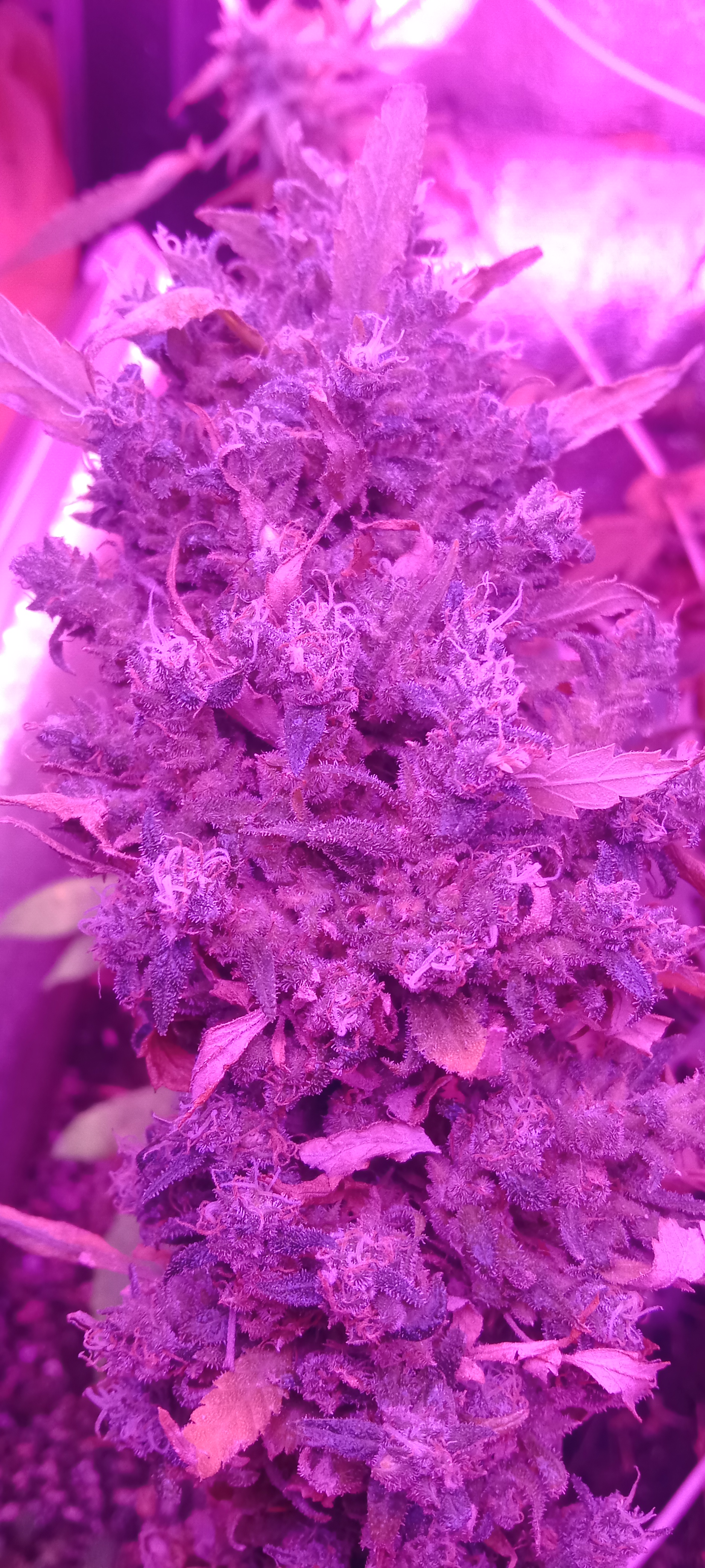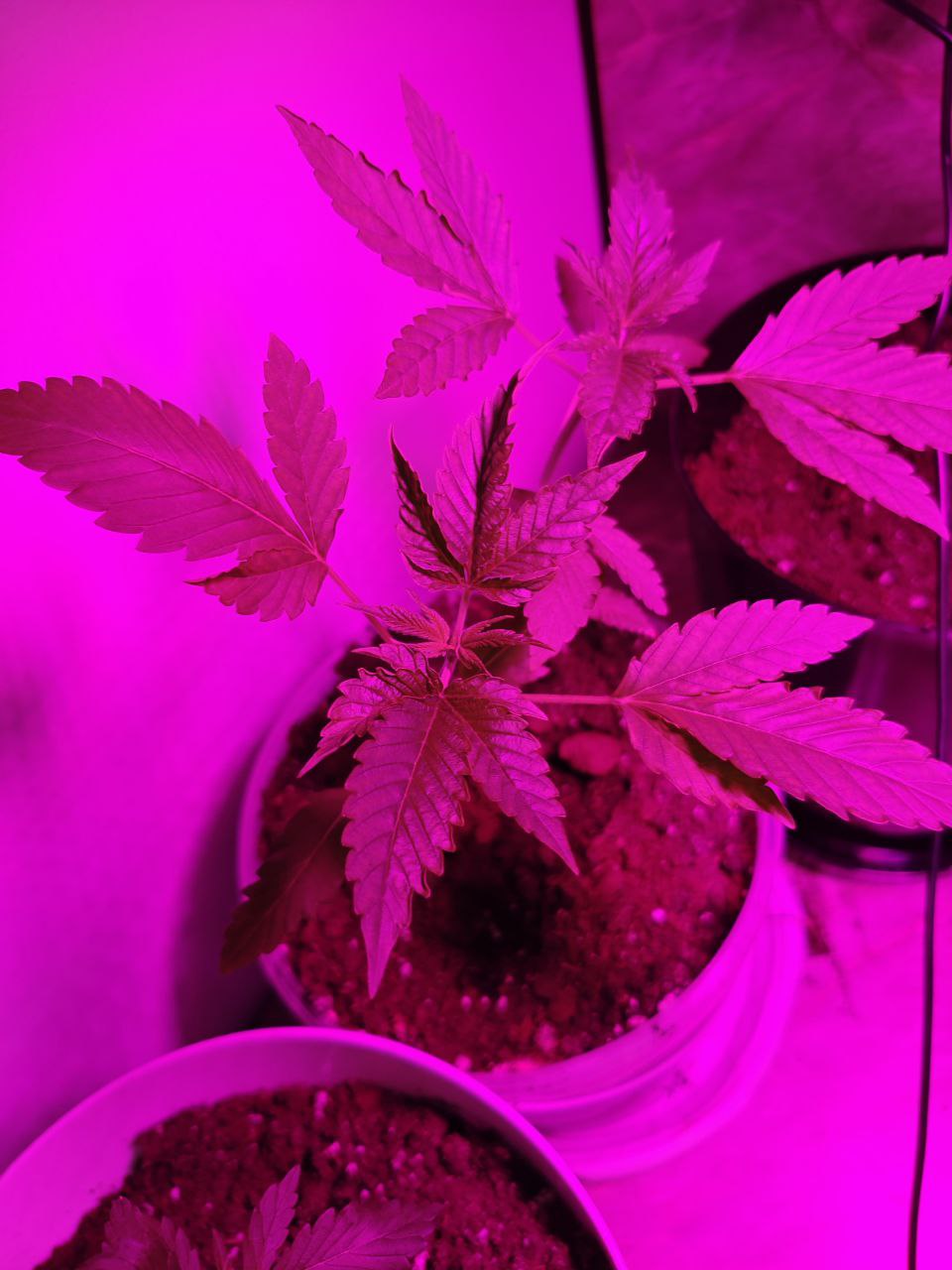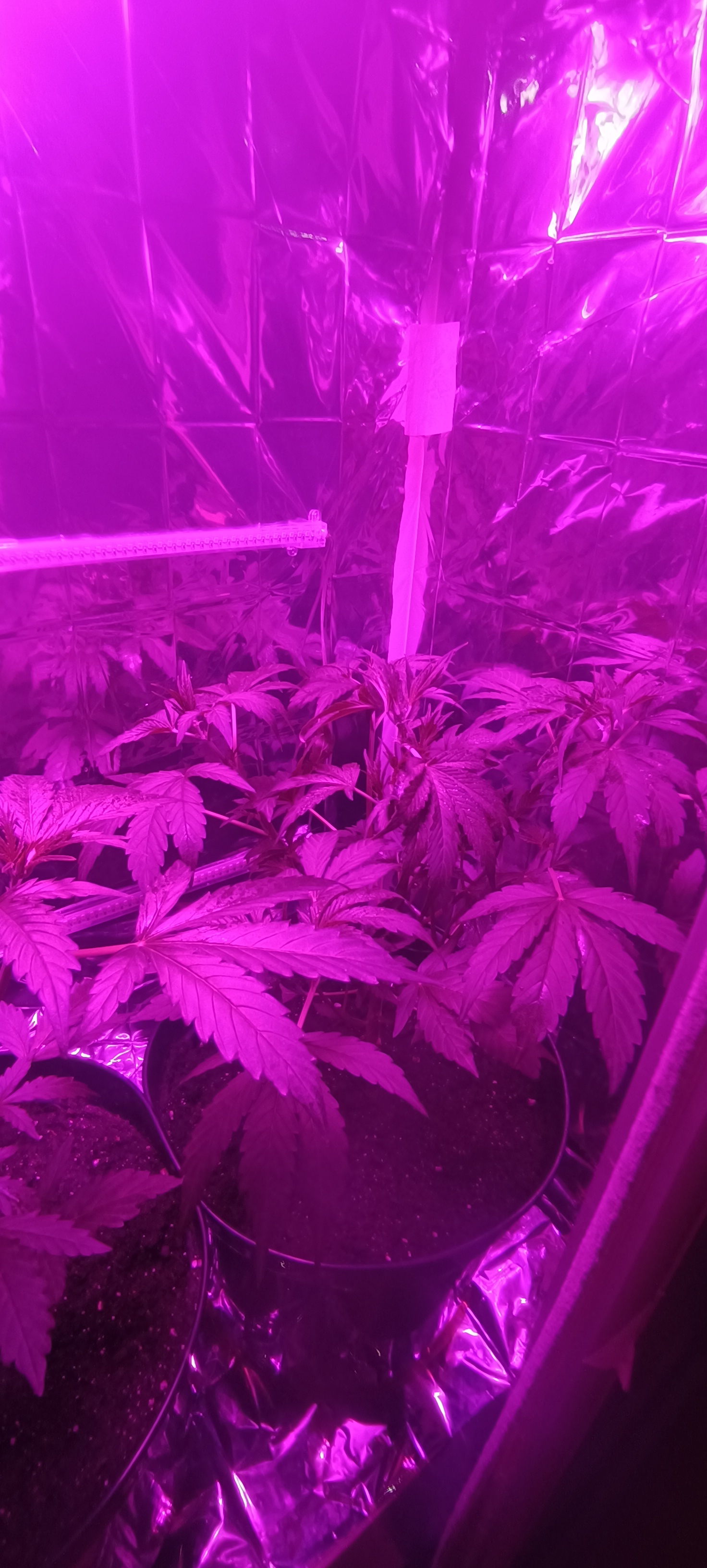Сейчас 2 лампы по 100вт китайские лэд и китайские лампы по бокам на досветы по 10вт 4шт. Горшки 10л, дренаж керамзит, пакет с co2 сверху. Досвет пока не включаю, перестает идти рост вверх, запущу на стадии цвета. Изначально использовал удобрения "Ломоносов" с вб, сейчас взял ghe (terra aquatica). Кароче если бы не мои косяки, выросли бы уже намного больше.