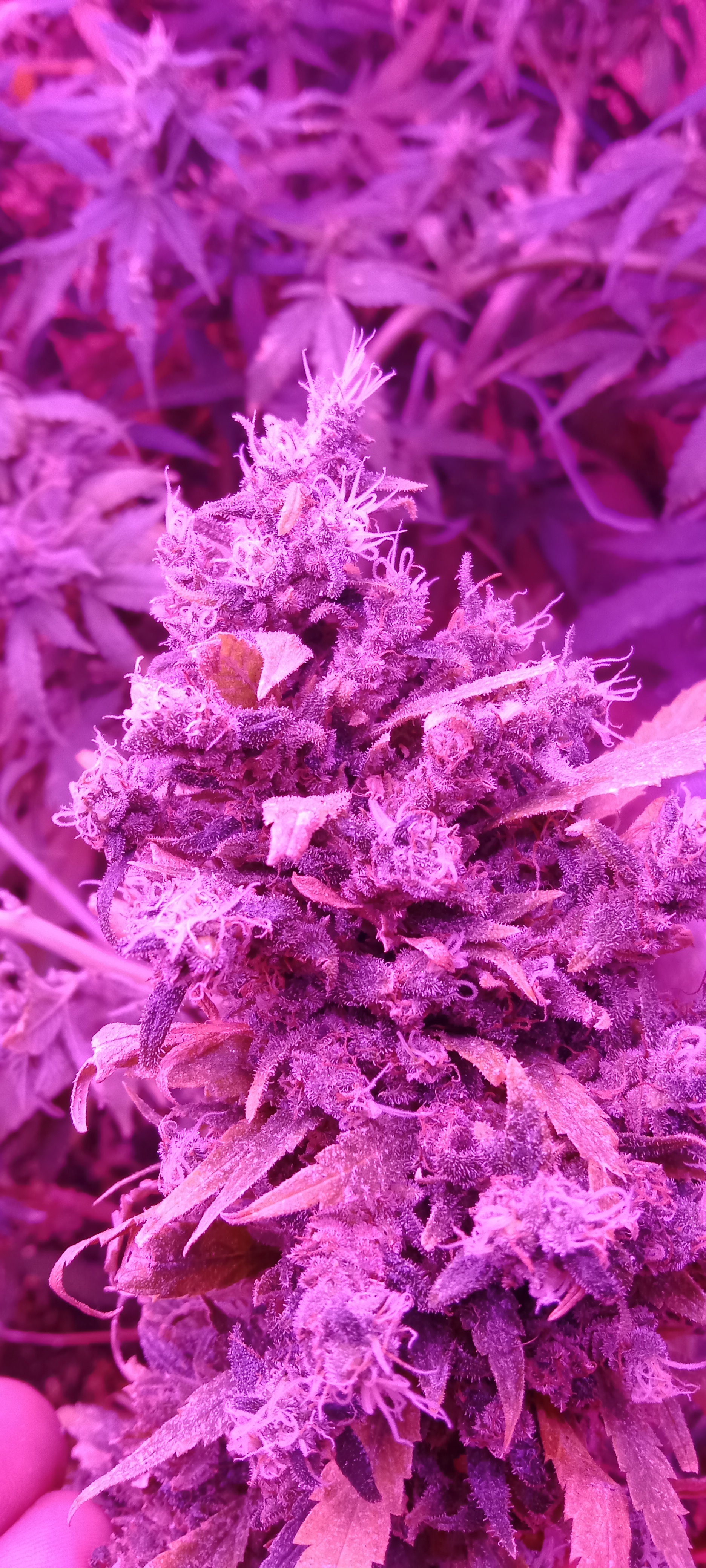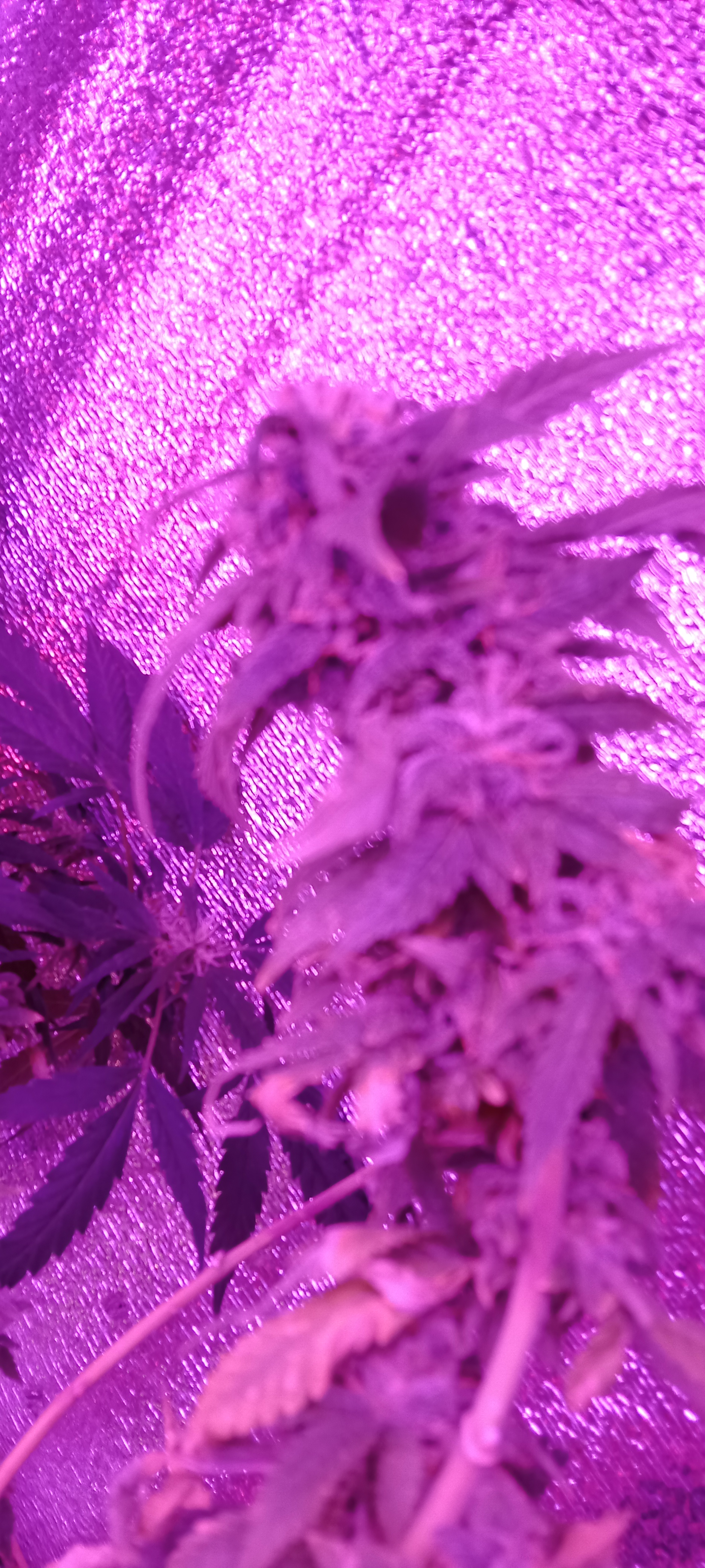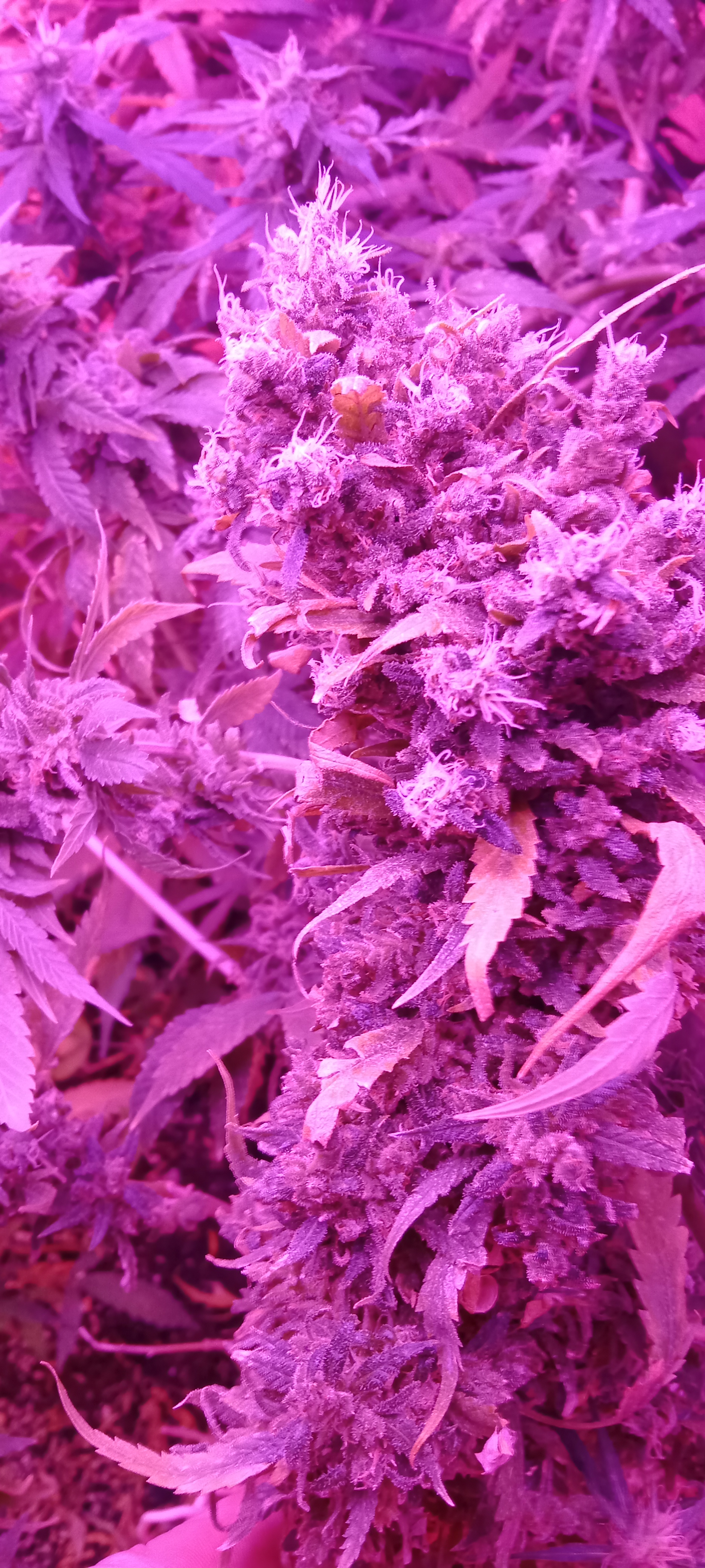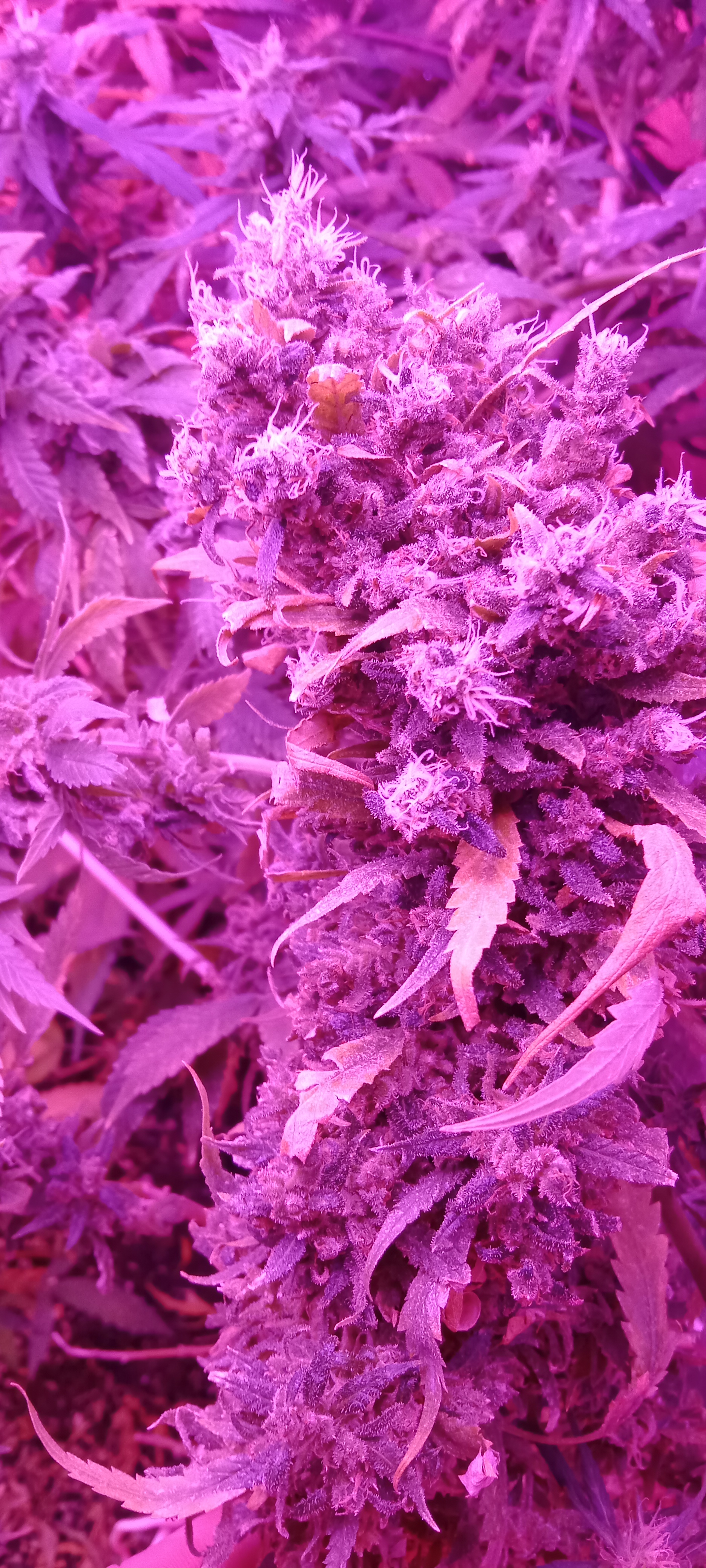 Сейчас 2 лампы по 100вт китайские лэд и китайские лампы по бокам на досветы по 10вт 4шт. Горшки 10л, дренаж керамзит, пакет с co2 сверху. Досвет пока не включаю, перестает идти рост вверх, запущу на стадии цвета. Изначально использовал удобрения "Ломоносов" с вб, сейчас взял ghe (terra aquatica). Кароче если бы не мои косяки, выросли бы уже намного больше.